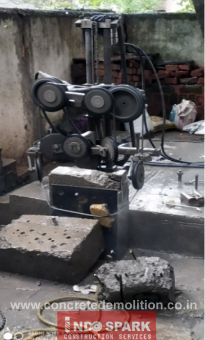 We at Indo Spark Construction Services provide Diamond Wire Sawing Work Services, Vibration Free Concrete Breaking / Demolition / Cutting Work Services using specialized machines and equipment. We provide this service all over India as well as the neighbouring countries. Diamond wire sawing uses high cycle electric or hydraulic equipment and is the fastest and most versatile means of cutting heavily reinforced concrete. The wire saw easily handles the thick sections of all construction material with a cutting rate of 1m^2 /hour and above is achievable. The ability to cut circular openings upto 2500mm diameter leaving strength intact and smooth cut surface with no damage to the remaining structure can be achieved.